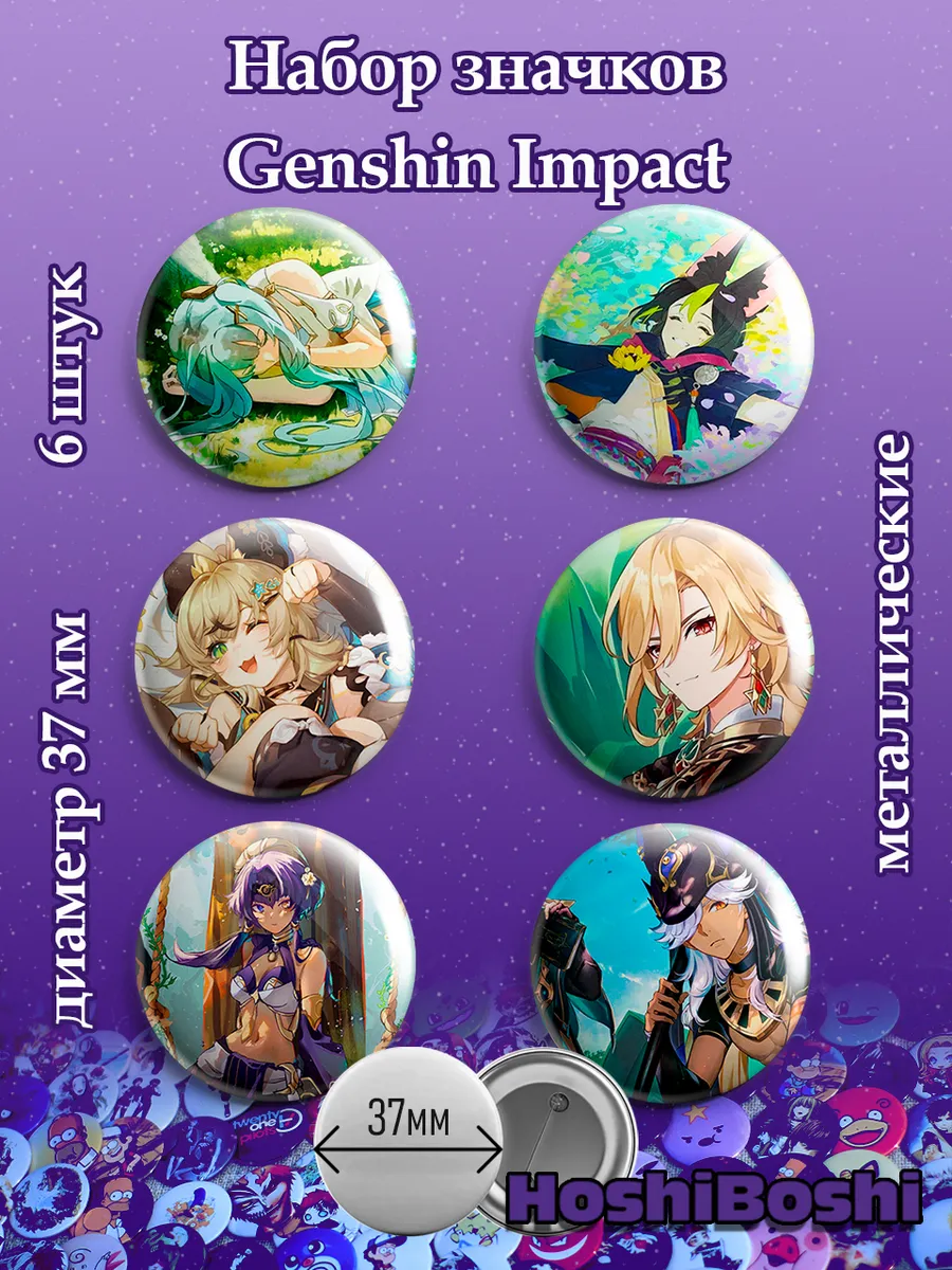 Набор из 6 металлических значков с изображениями из игры Геншин Импакт ( Genshin Impact ).