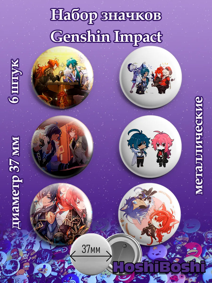 Набор из 6 металлических значков с изображениями из игры Геншин Импакт ( Genshin Impact ).