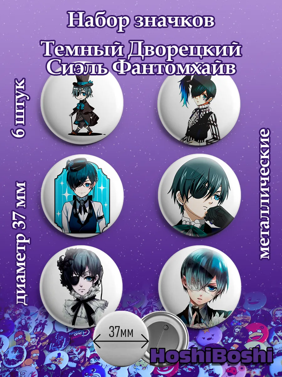 Набор из 6 металлических значков с изображениями из аниме Темный дворецкий ( Kuroshitsuji Black Butler ).