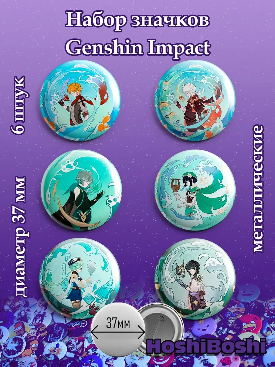 Набор из 6 металлических значков с изображениями из игры Геншин Импакт ( Genshin Impact ).