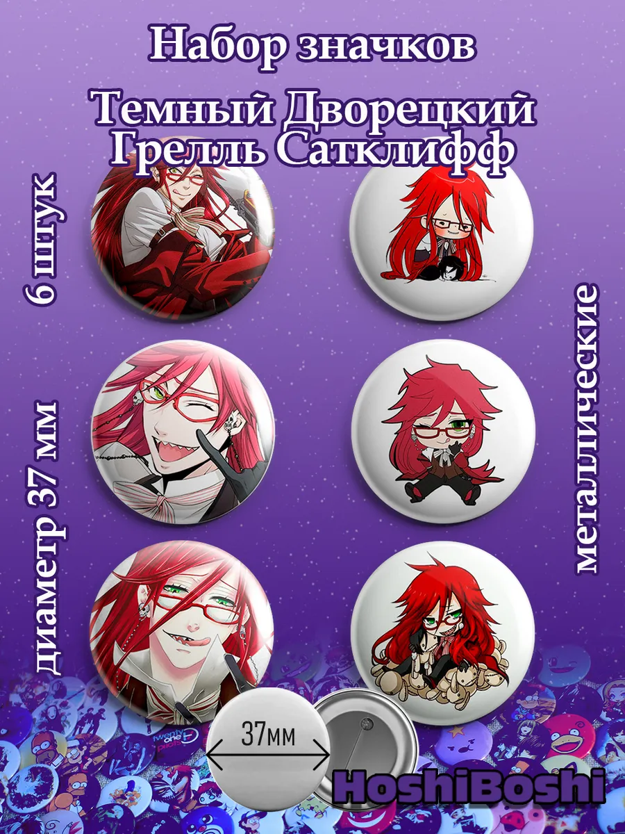 Набор из 6 металлических значков с изображениями из аниме Темный дворецкий ( Kuroshitsuji Black Butler ).