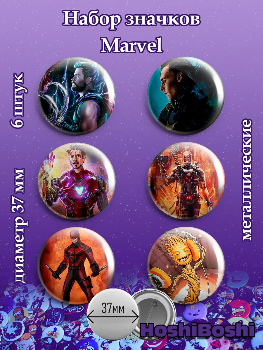 Набор из 6 металлических значков с изображениями из персонажей вселенной Марвел ( Marvel ).