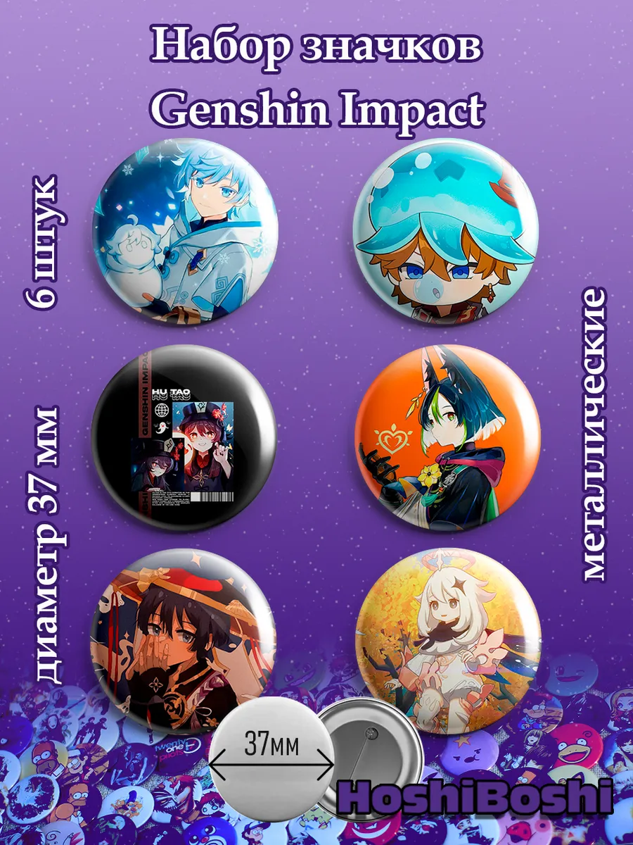 Набор из 6 металлических значков с изображениями из игры Геншин Импакт ( Genshin Impact ).