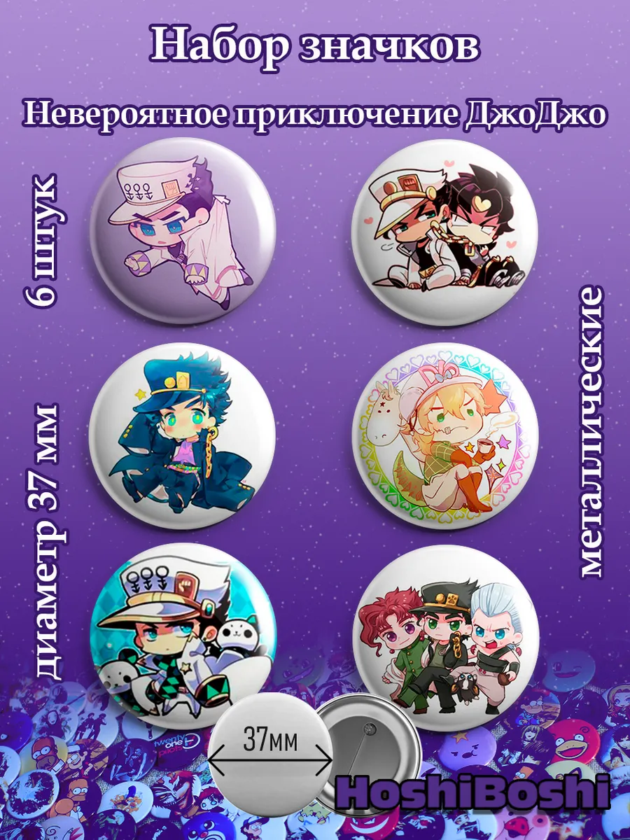 Набор из 6 металлических значков с изображениями из аниме Невероятные Приключения Джо Джо ( JoJo's Bizarre Adventure ).