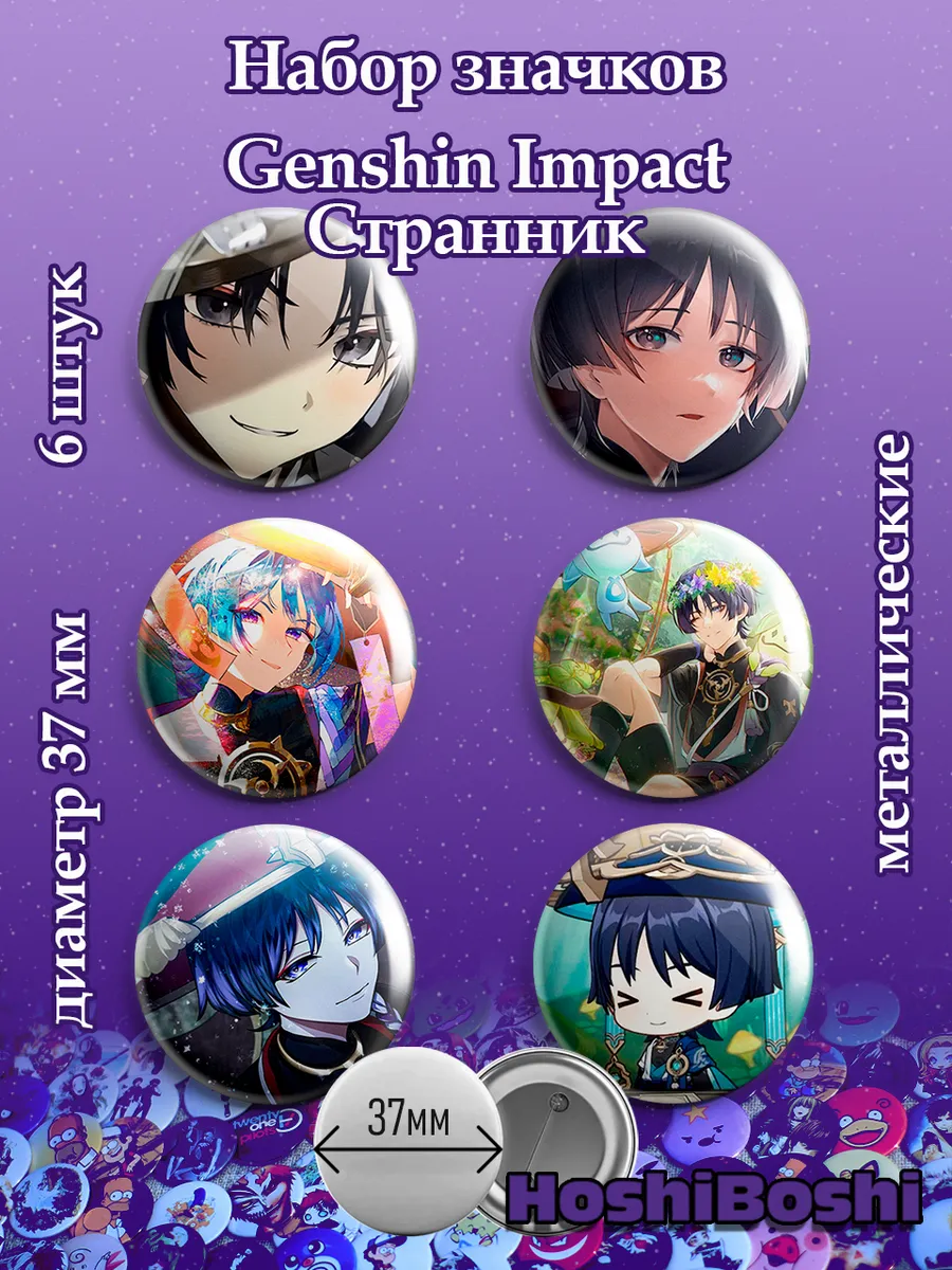 Набор из 6 металлических значков с изображениями из игры Геншин Импакт ( Genshin Impact ).