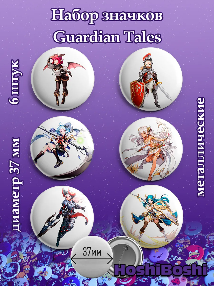 Набор из 6 металлических значков с изображениями из игры Гардиан Тэйл ( Guardian Tales ).