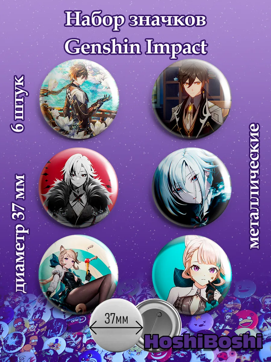Набор из 6 металлических значков с изображениями из игры Геншин Импакт ( Genshin Impact ).