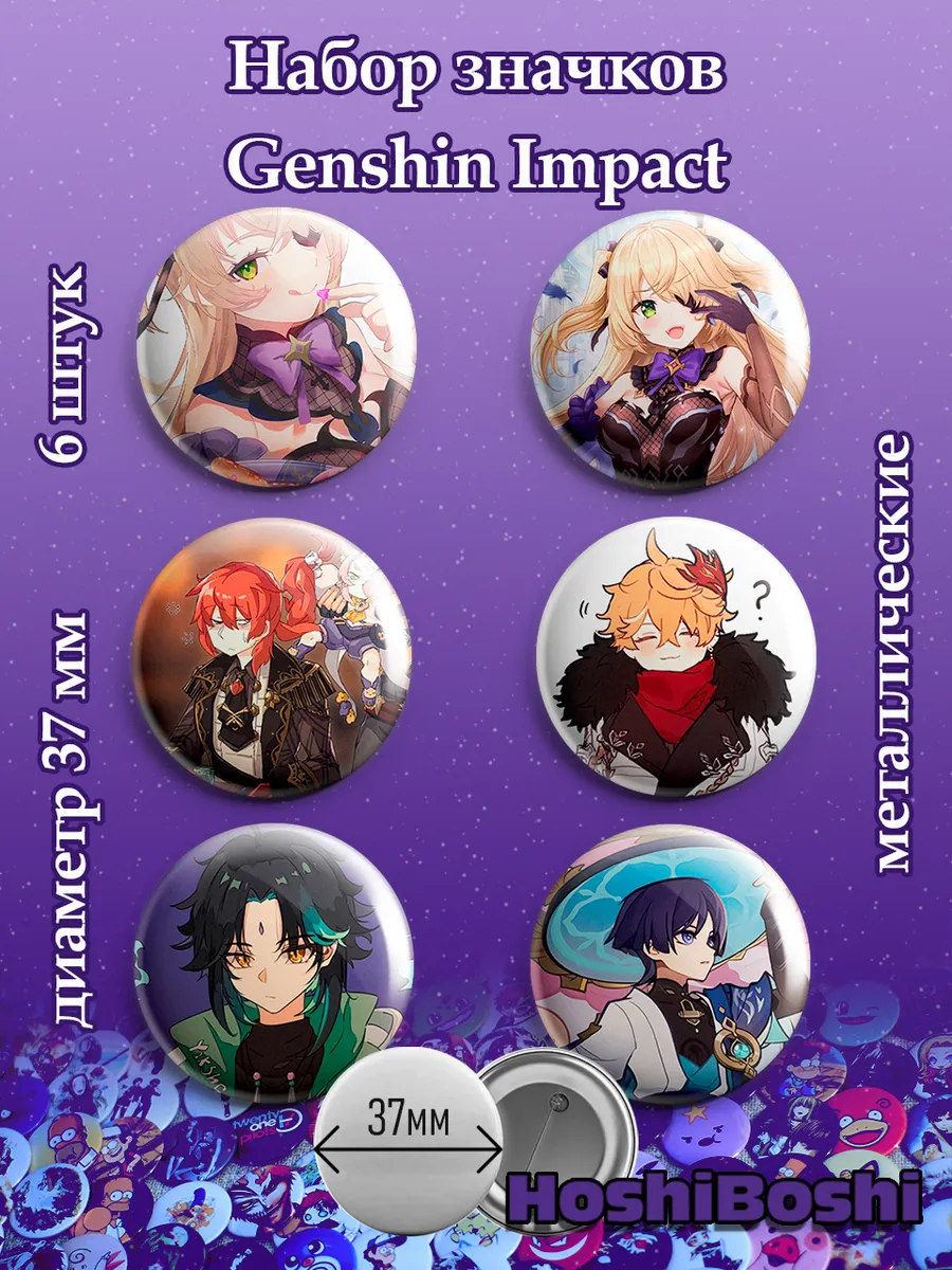 Набор из 6 металлических значков с изображениями из игры Геншин Импакт ( Genshin Impact ).