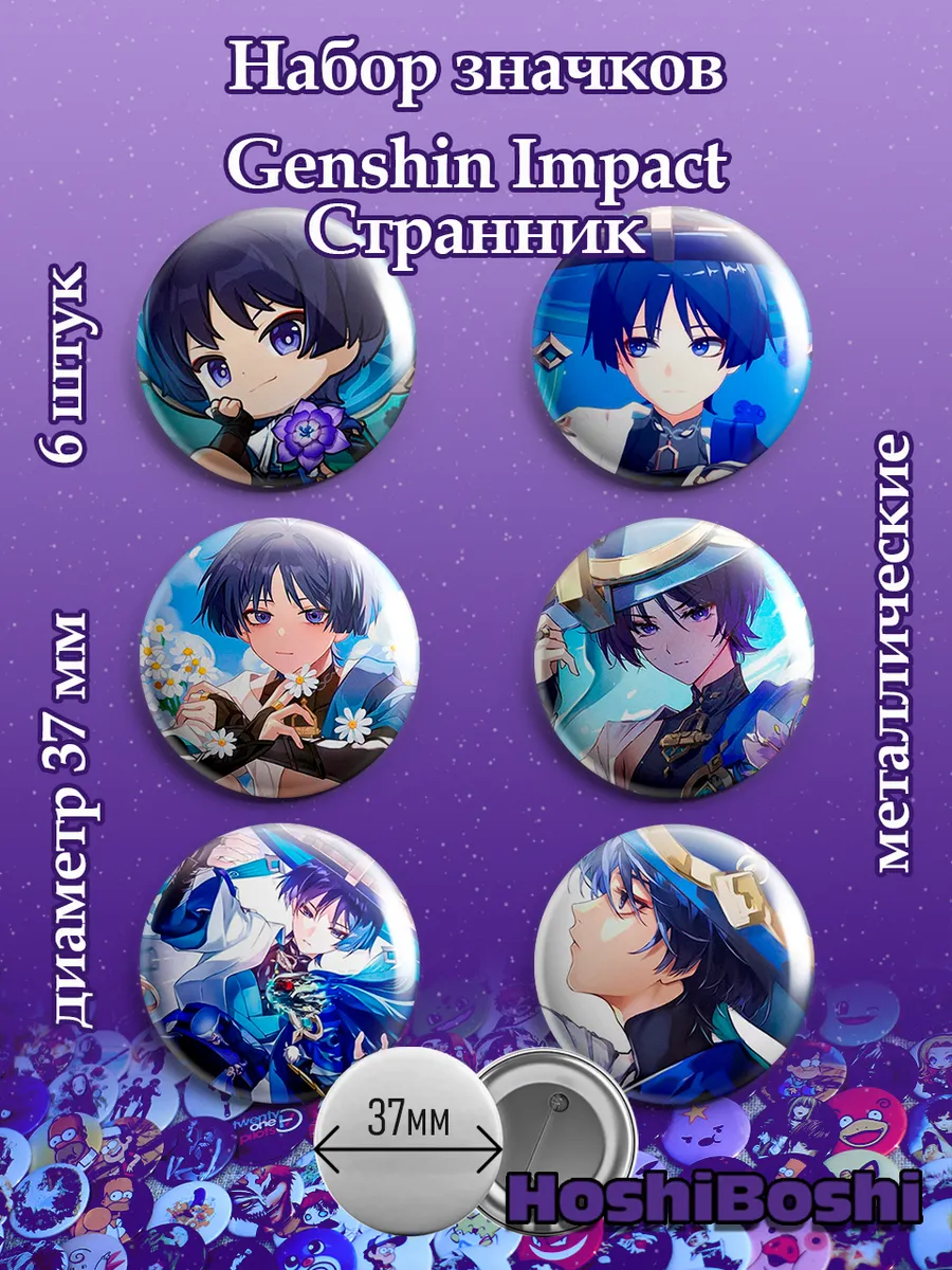 Набор из 6 металлических значков с изображениями из игры Геншин Импакт ( Genshin Impact ).