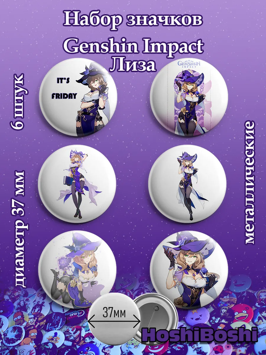 Набор из 6 металлических значков с изображениями из игры Геншин Импакт ( Genshin Impact ).