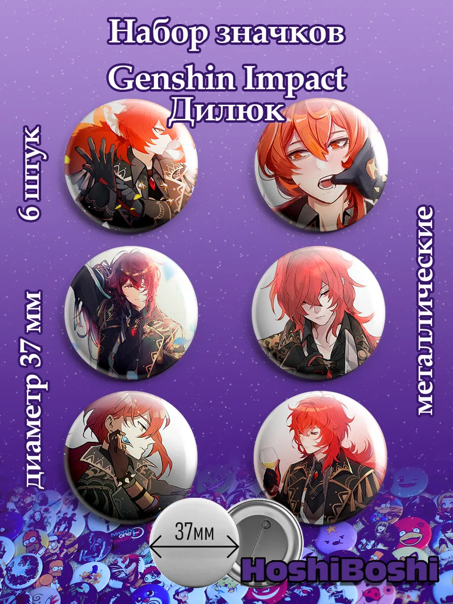 Набор из 6 металлических значков с изображениями из игры Геншин Импакт ( Genshin Impact ).