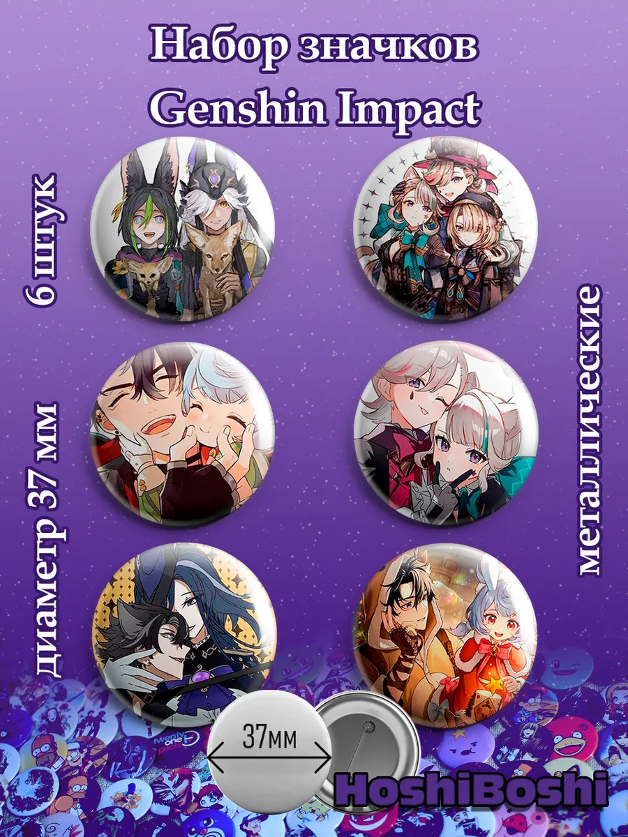 Набор из 6 металлических значков с изображениями из игры Геншин Импакт ( Genshin Impact ).
