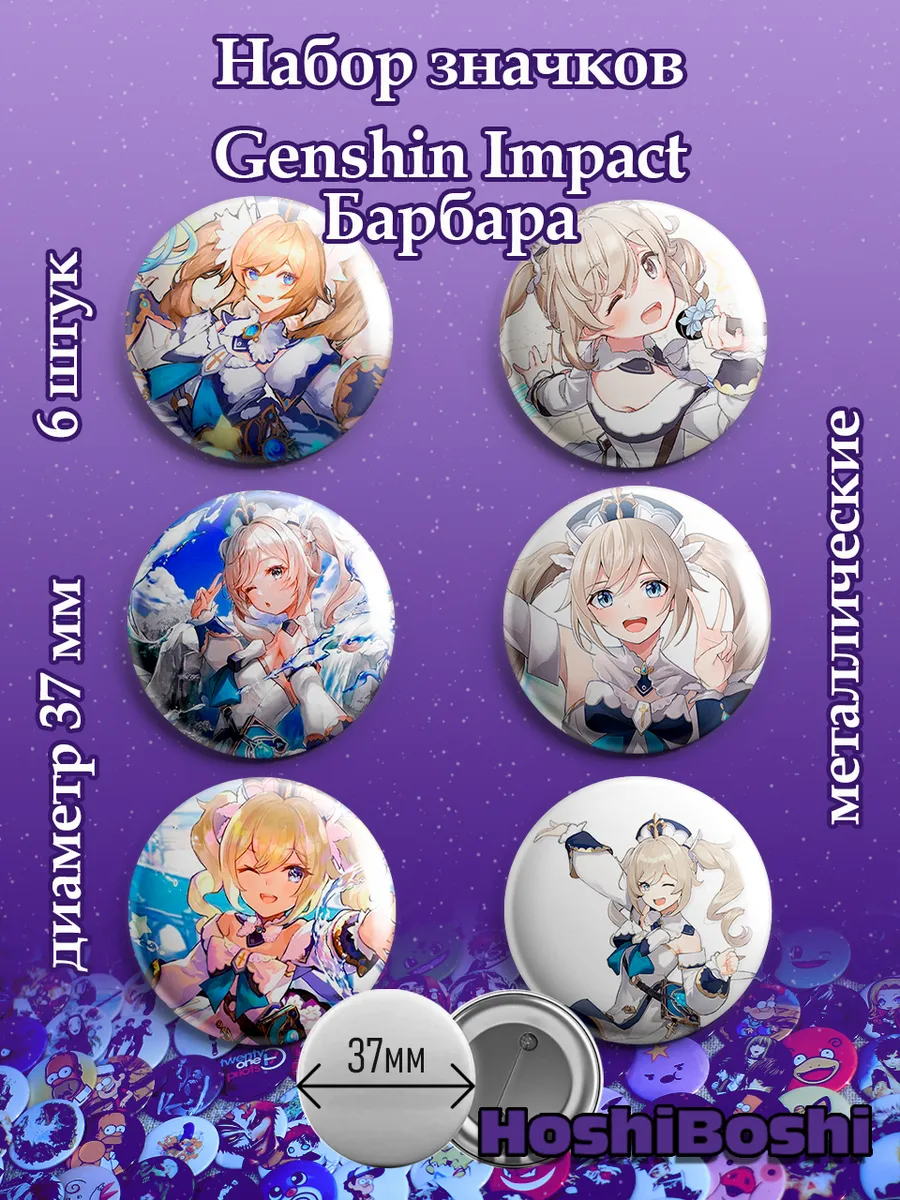 Набор из 6 металлических значков с изображениями из игры Геншин Импакт ( Genshin Impact ).