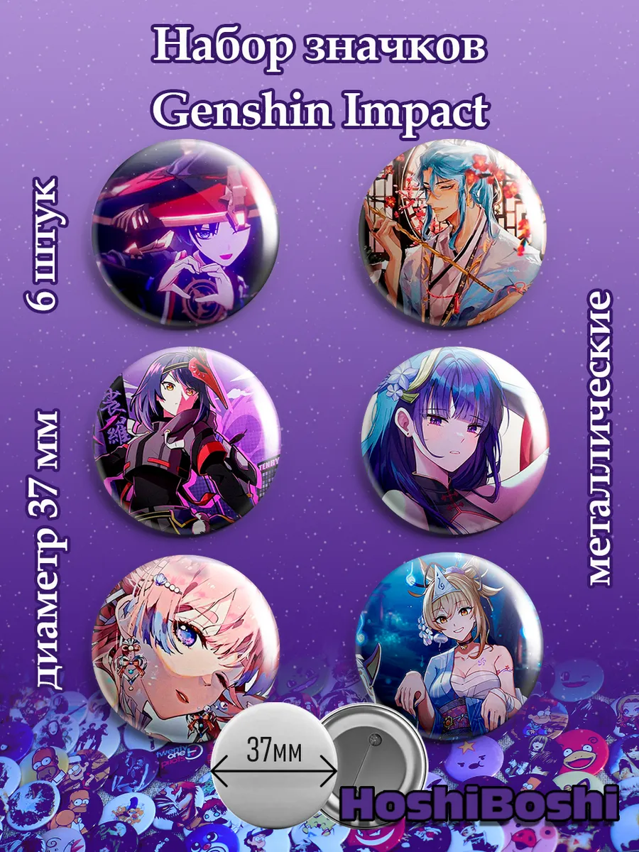 Набор из 6 металлических значков с изображениями из игры Геншин Импакт ( Genshin Impact ).