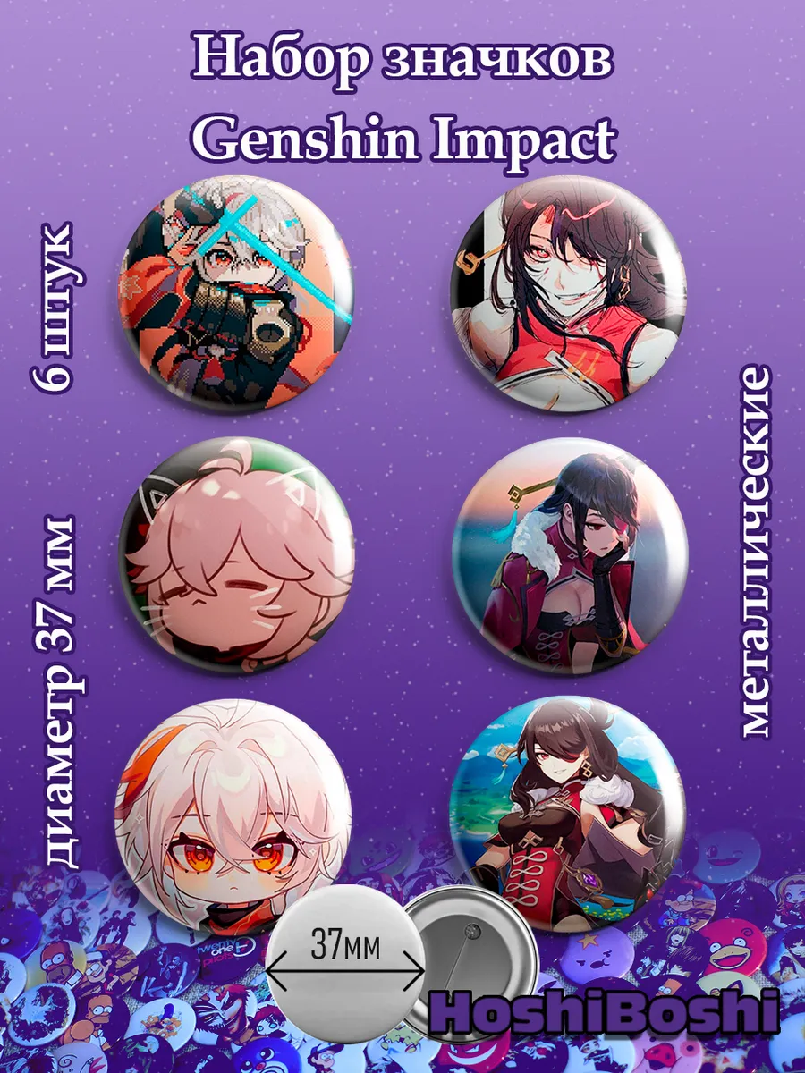 Набор из 6 металлических значков с изображениями из игры Геншин Импакт ( Genshin Impact ).