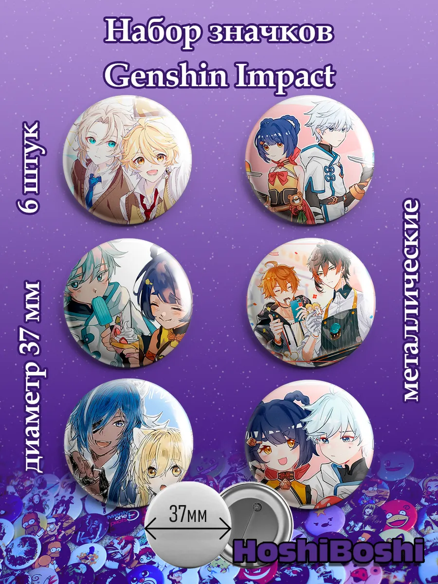 Набор из 6 металлических значков с изображениями из игры Геншин Импакт ( Genshin Impact ).