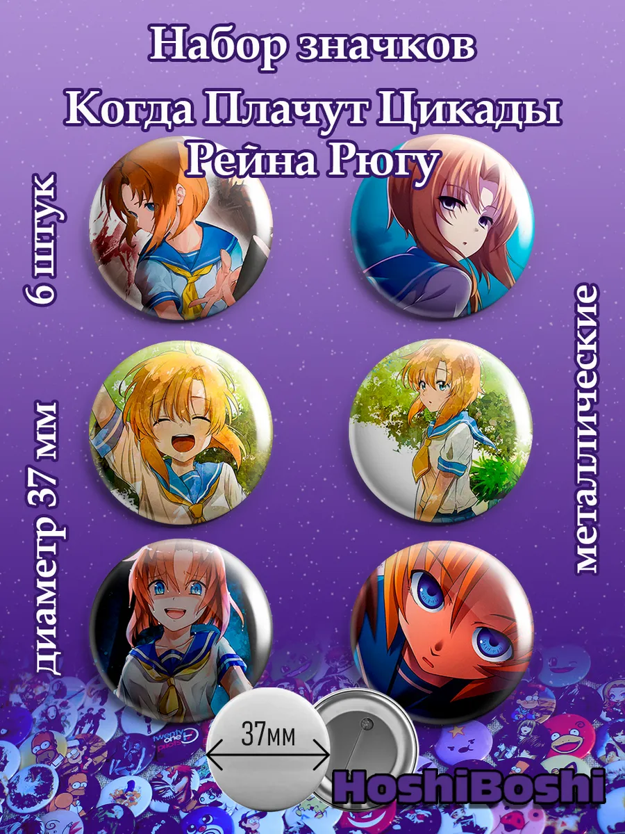 Набор из 6 металлических значков с изображениями из аниме Когда Плачут Цикады ( Higurashi no Naku Koro ni ).