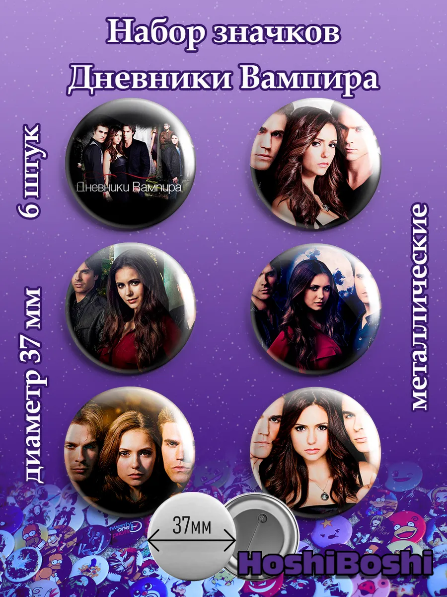 Набор из 6 металлических значков с изображениями из сериала Дневники Вампира ( The Vampire Diaries ).