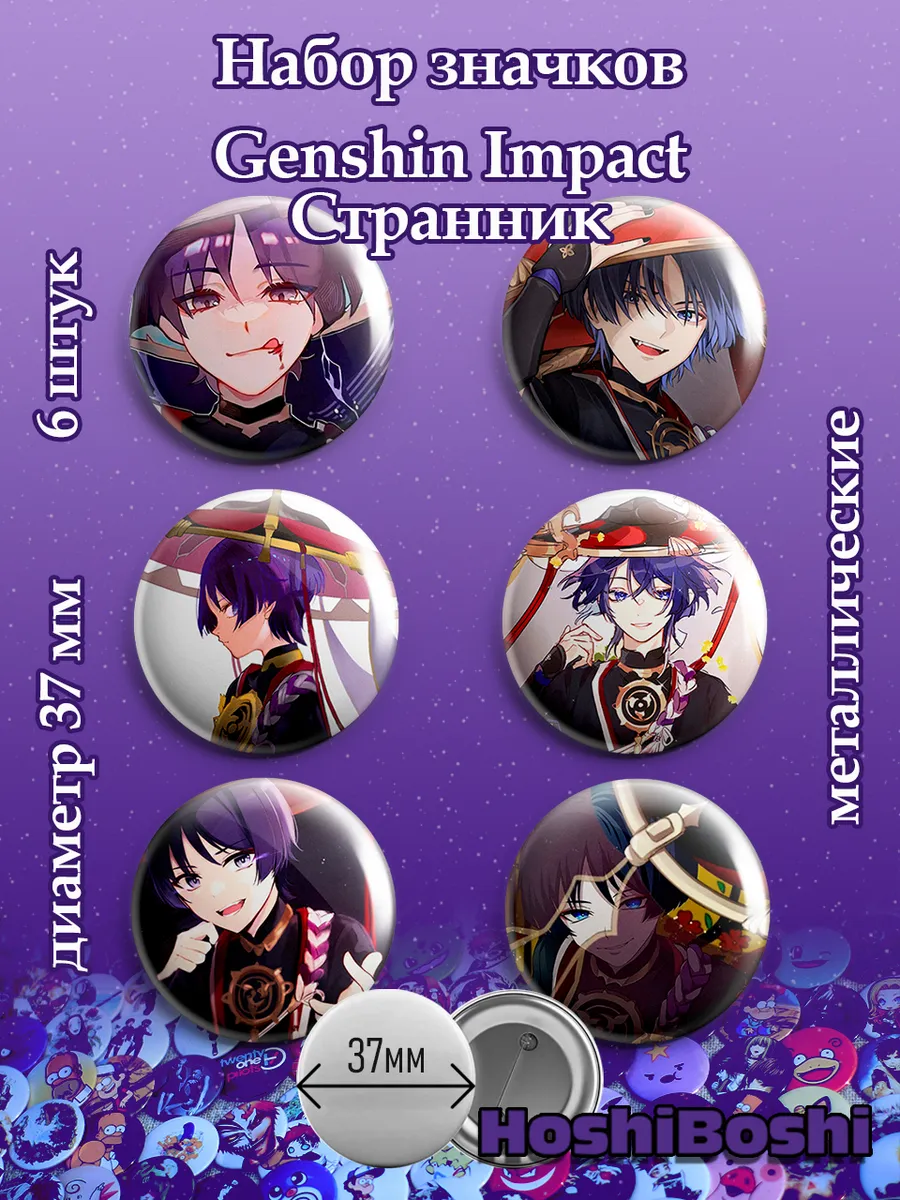 Набор из 6 металлических значков с изображениями из игры Геншин Импакт ( Genshin Impact ).