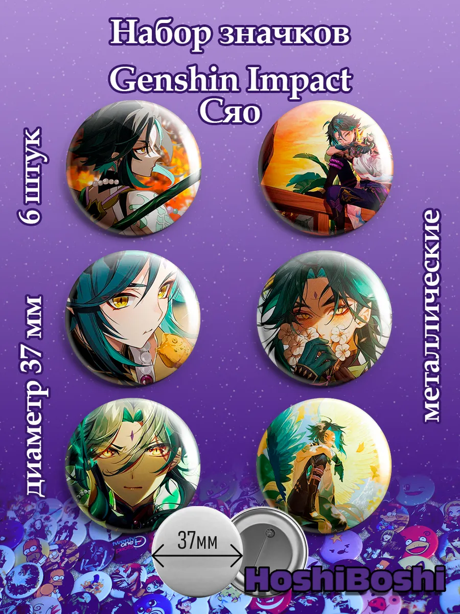 Набор из 6 металлических значков с изображениями из игры Геншин Импакт ( Genshin Impact ).