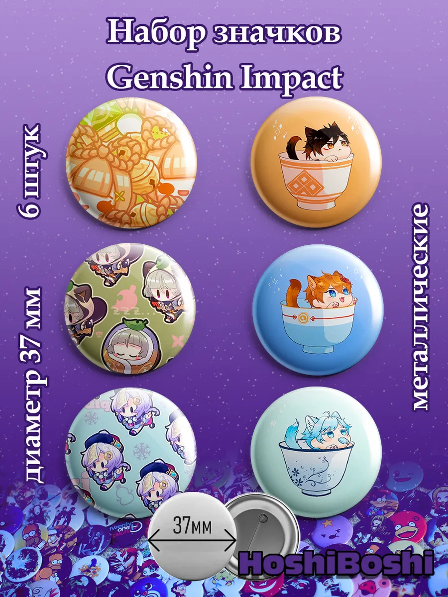 Набор из 6 металлических значков с изображениями из игры Геншин Импакт ( Genshin Impact ).