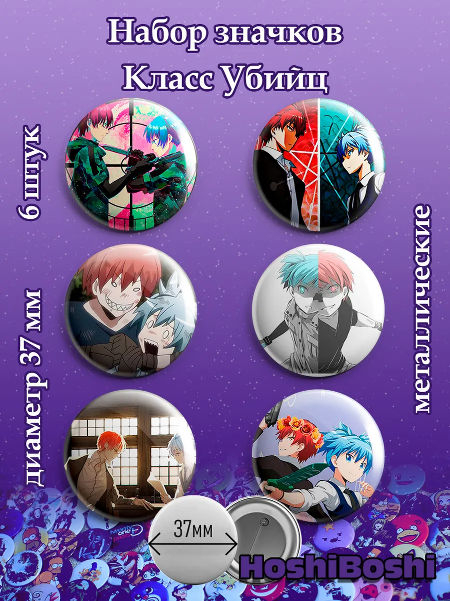Набор из 6 металлических значков с изображениями из аниме Класс Убийц ( Ansatsu Kyoushitsu Assassination Classroom ).