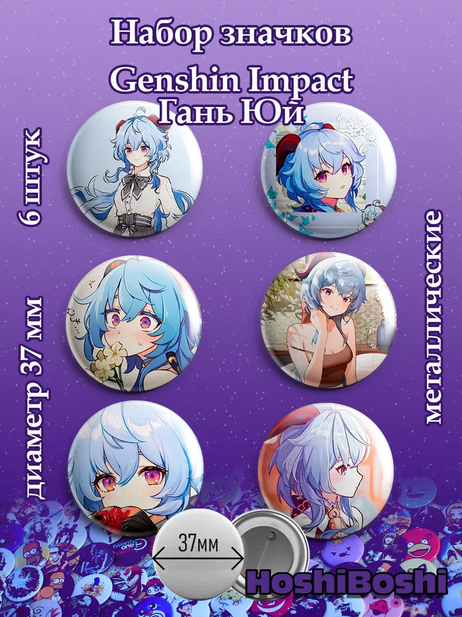 Набор из 6 металлических значков с изображениями из игры Геншин Импакт ( Genshin Impact ).