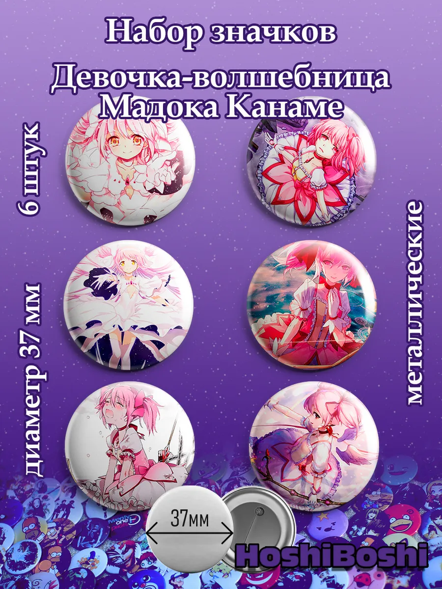 Набор из 6 металлических значков с изображениями из аниме Девочка Волшебница Мадока ( Mahou Shoujo Madoka Magica ).