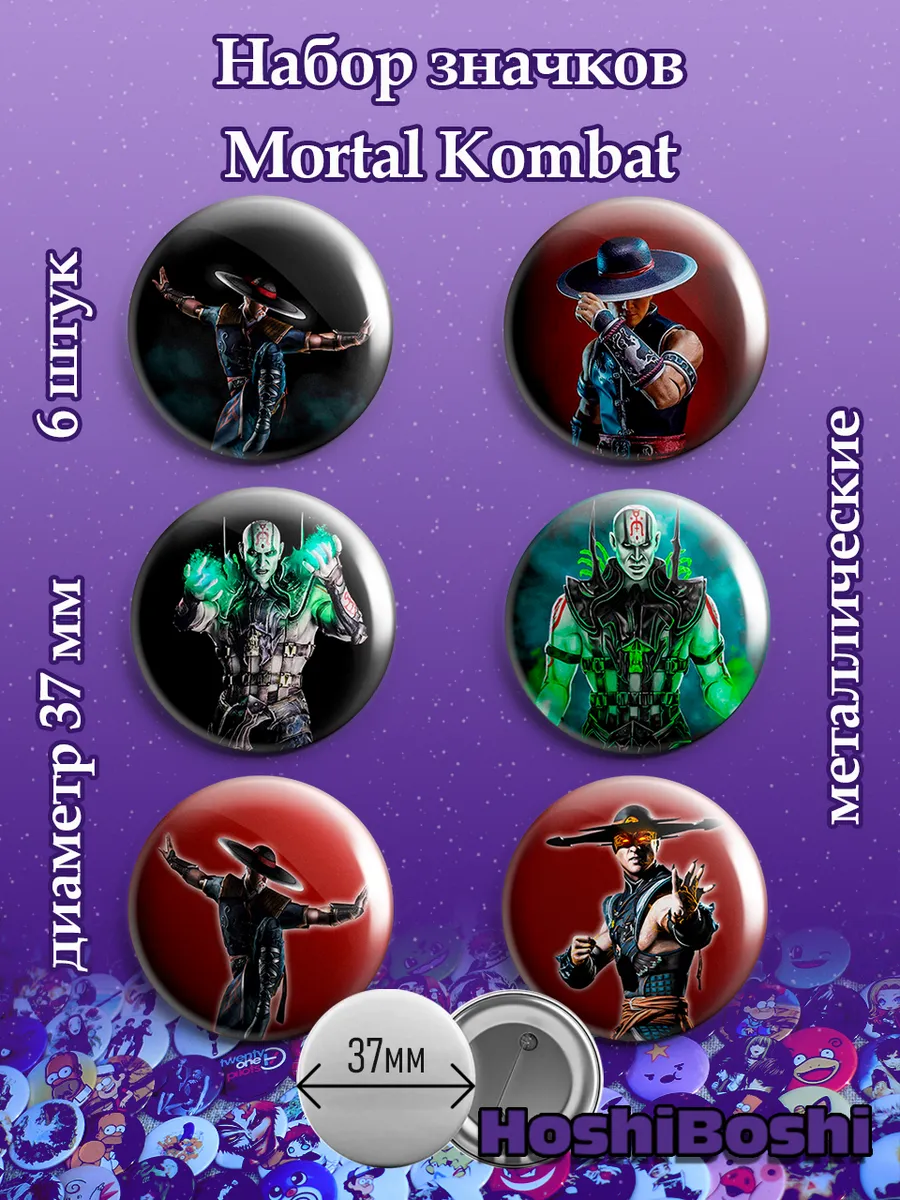 Набор из 6 металлических значков с изображениями из игры Мортал Комбат ( Mortal Kombat ).