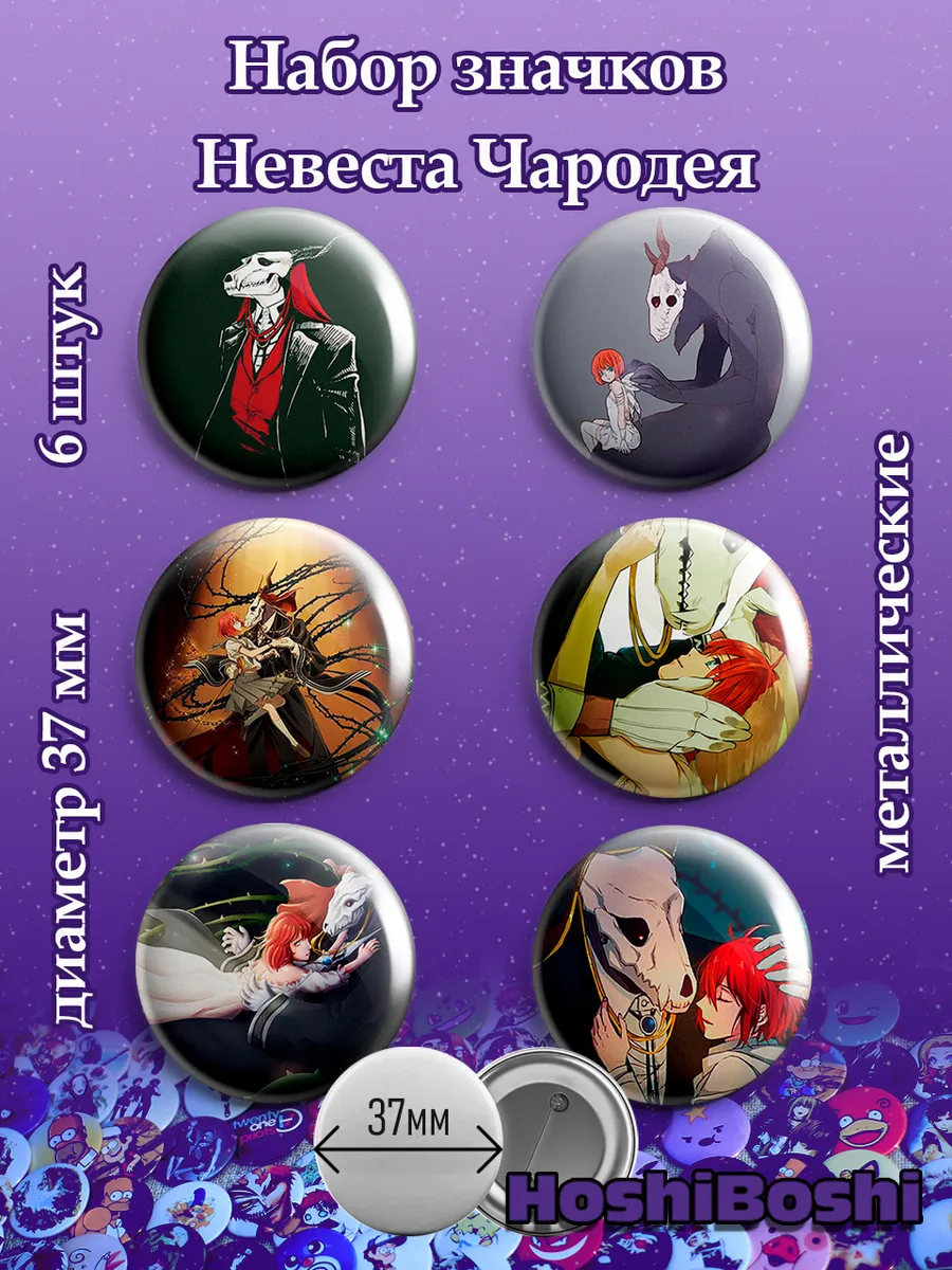 Набор из 6 металлических значков с изображениями из аниме Невеста Чародея (Mahoutsukai no Yome ).