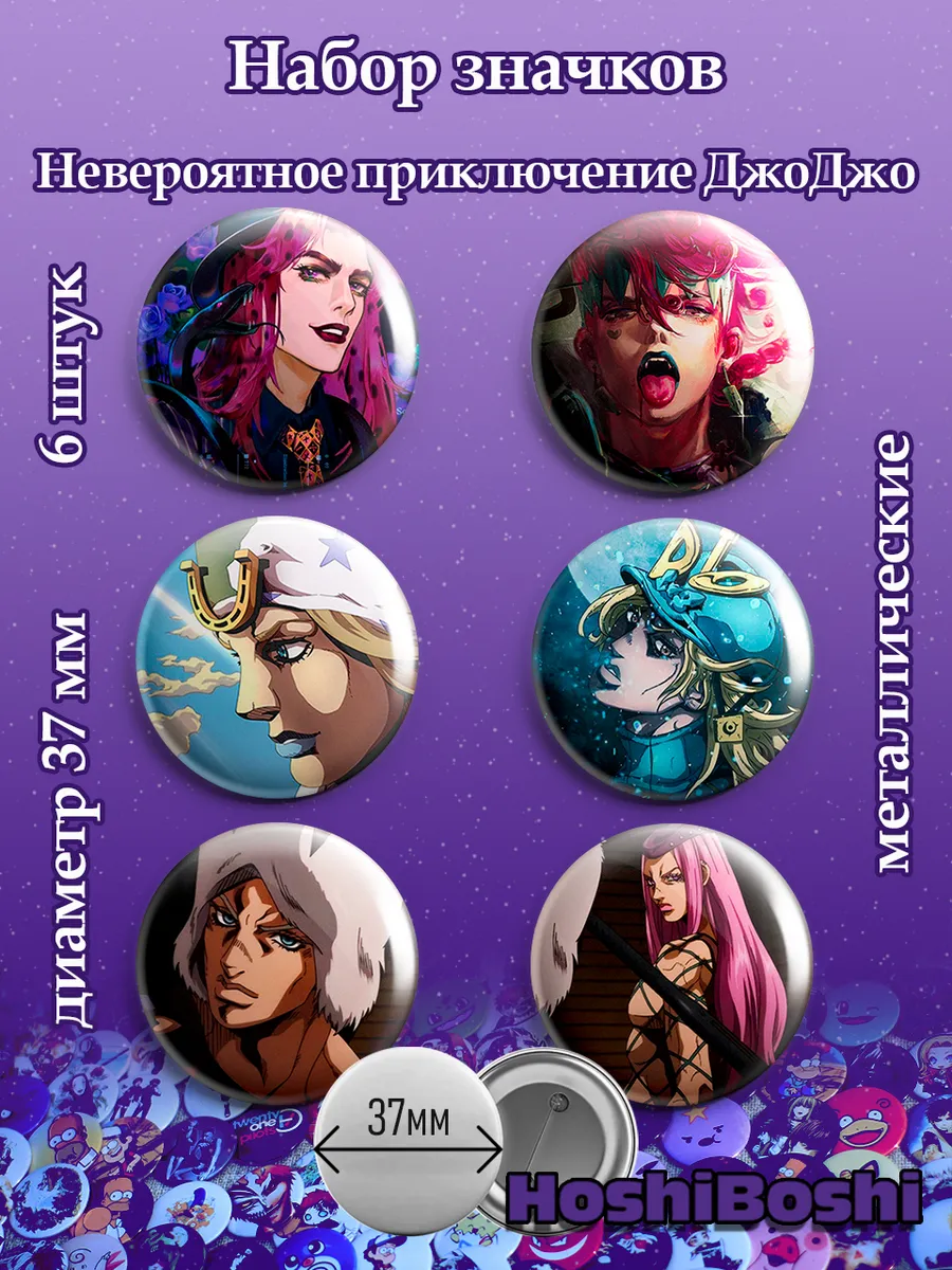 Набор из 6 металлических значков с изображениями из аниме Невероятные Приключения Джо Джо ( JoJo's Bizarre Adventure ).