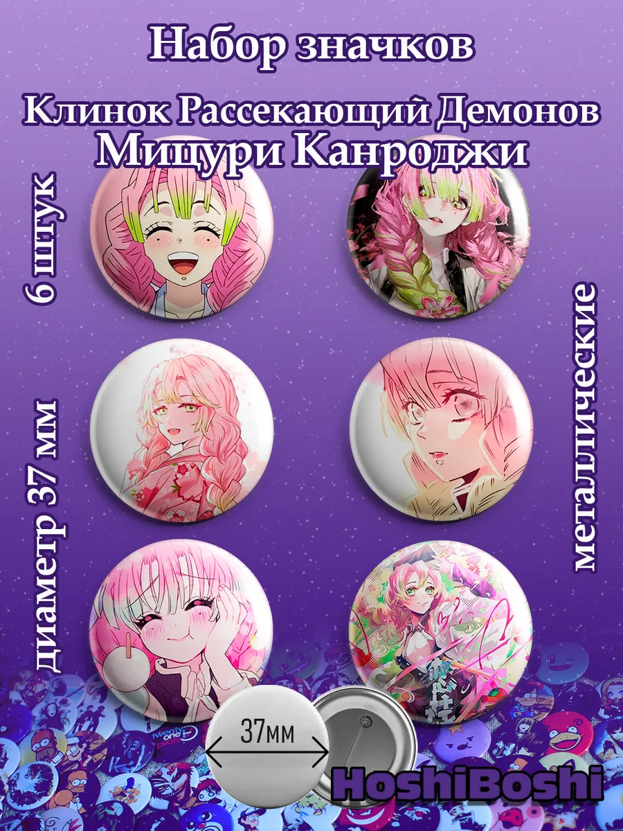 Набор из 6 металлических значков с изображениями из аниме Клинок Рассекающий Демонов ( Demon Slayer: Kimetsu no Yaiba ).