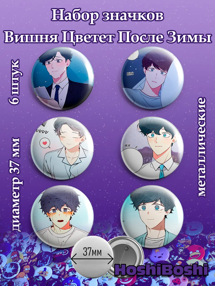 Набор из 6 металлических значков с изображениями из манхвы Вишня Цветет после Зимы ( Cherry Blossoms After Winter ).