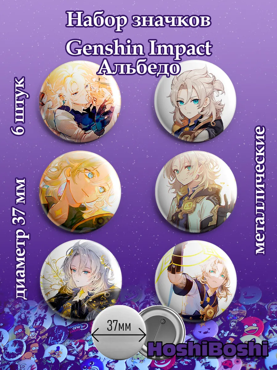 Набор из 6 металлических значков с изображениями из игры Геншин Импакт ( Genshin Impact ).