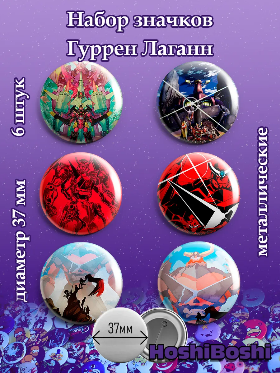 Набор из 6 металлических значков с изображениями из аниме Гуррен Лаганн ( Tengen Toppa Gurren Lagann ).