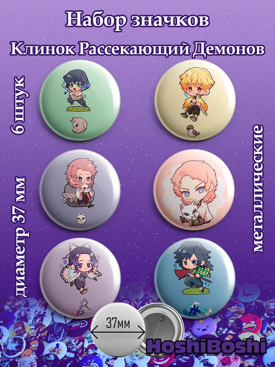 Набор из 6 металлических значков с изображениями из аниме Клинок Рассекающий Демонов ( Demon Slayer: Kimetsu no Yaiba ).