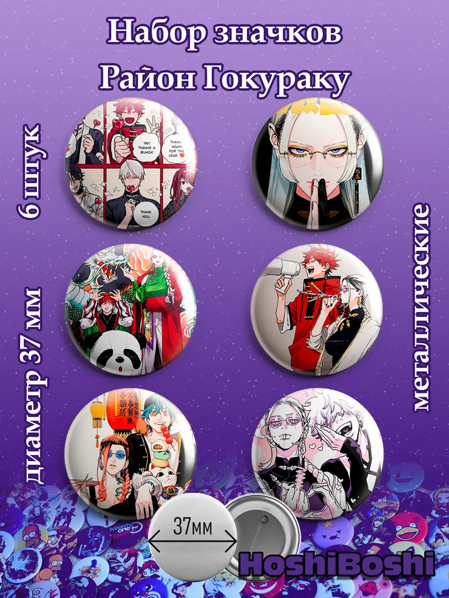 Набор из 6 металлических значков с изображениями из манги Район Гокураку ( Gokurakugai ).