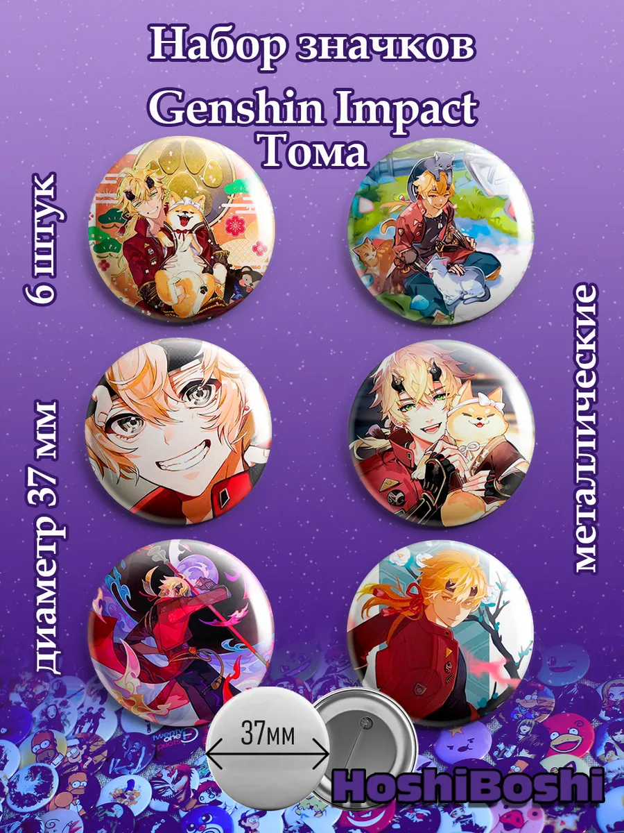 Набор из 6 металлических значков с изображениями из игры Геншин Импакт ( Genshin Impact ).