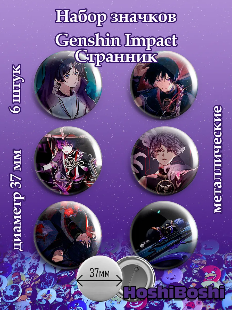 Набор из 6 металлических значков с изображениями из игры Геншин Импакт ( Genshin Impact ).