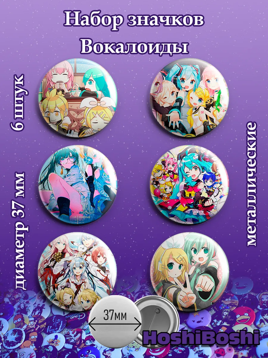 Набор из 6 металлических значков с изображениями Вокалоидов ( Vocaloid ).
