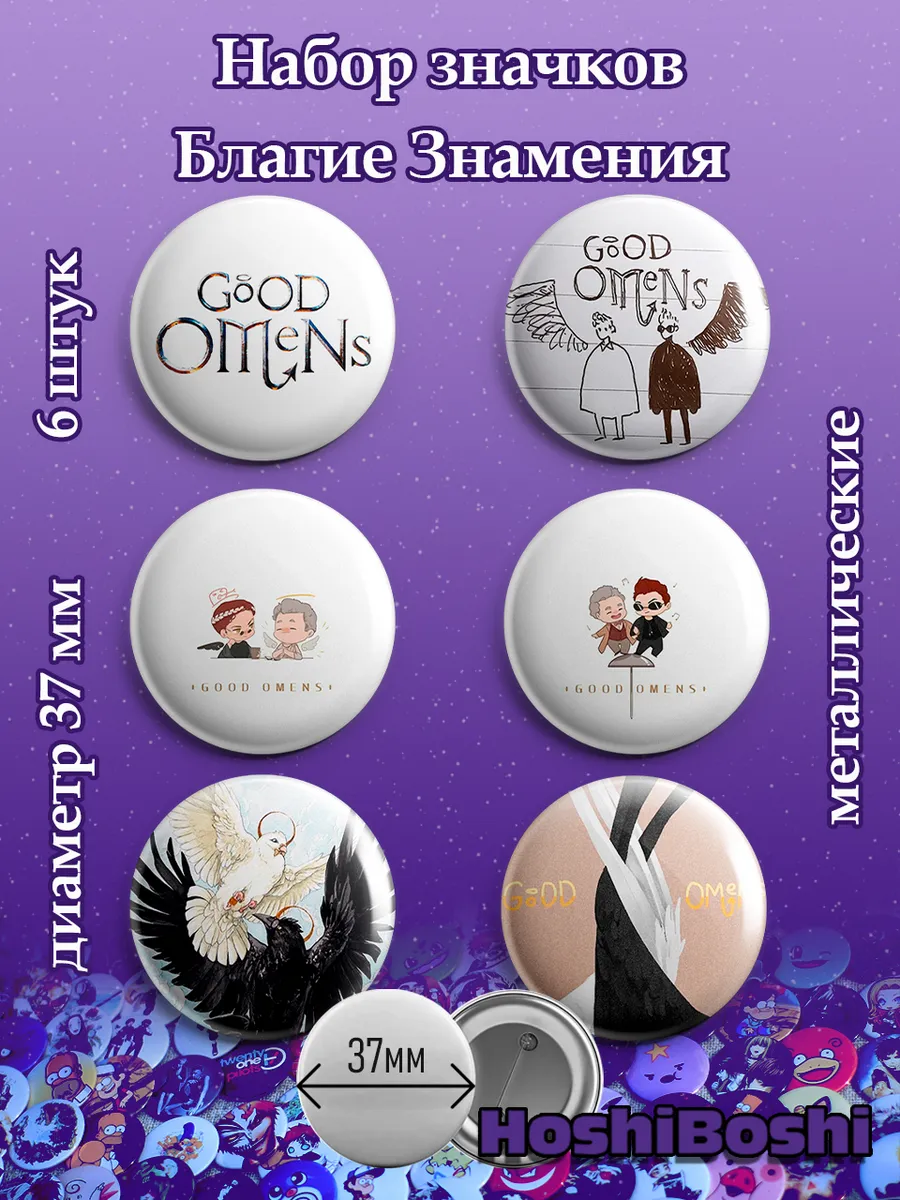 Набор из 6 металлических значков с изображениями из сериала Благие Знамения ( Good Omens ).