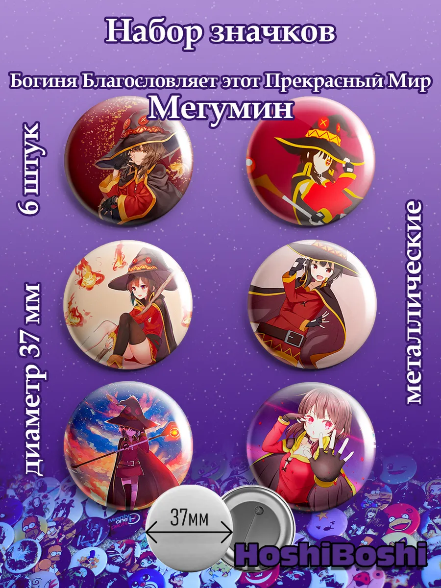 Набор из 6 металлических значков с изображениями из аниме Богиня благословляет этот замечательный мир Коносуба ( Kono Subarashii Sekai ni Shukufuku wo! KonoSuba ).