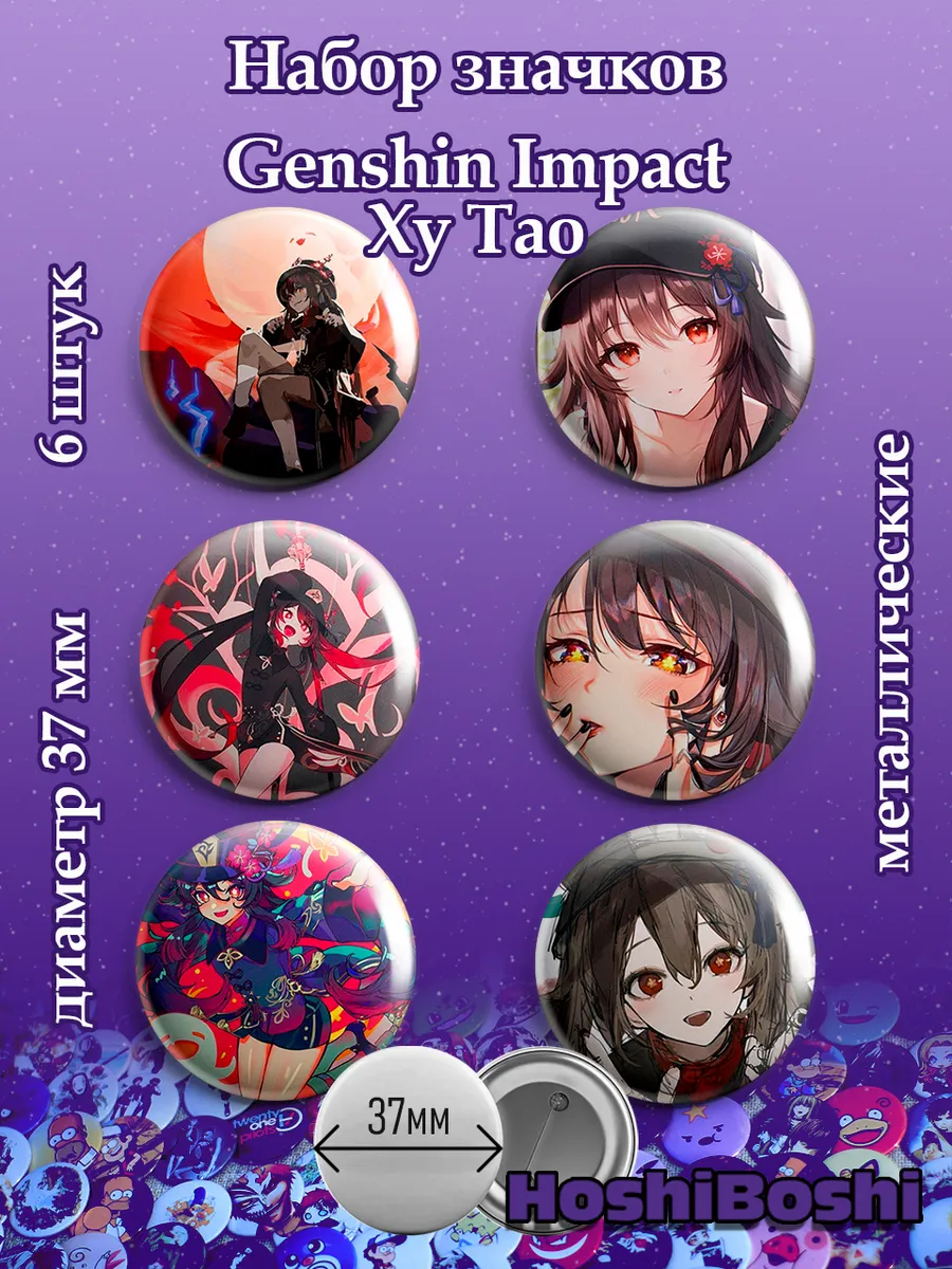 Набор из 6 металлических значков с изображениями из игры Геншин Импакт ( Genshin Impact ).