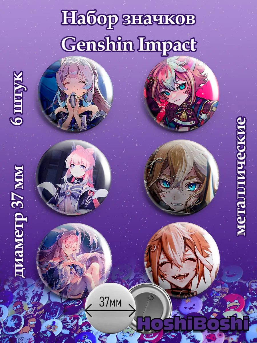 Набор из 6 металлических значков с изображениями из игры Геншин Импакт ( Genshin Impact ).