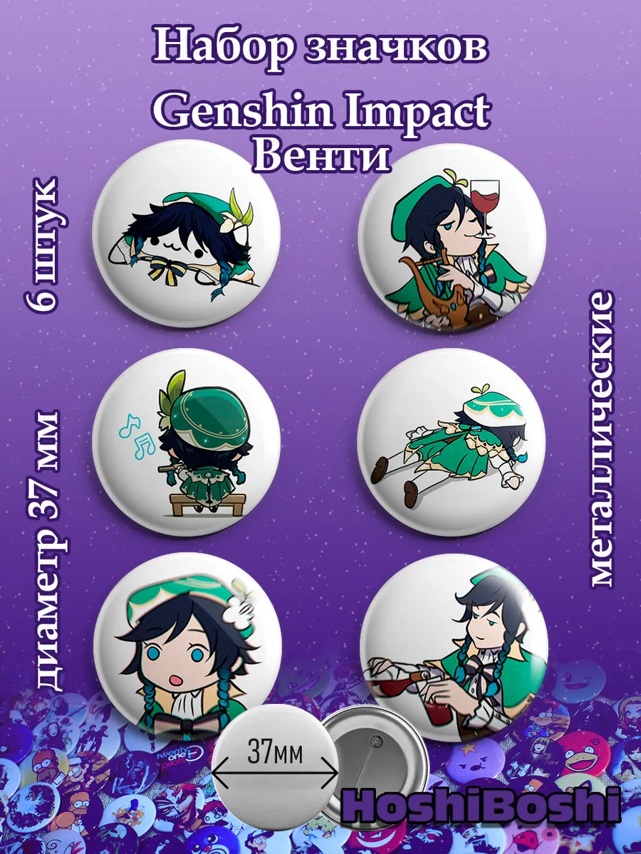 Набор из 6 металлических значков с изображениями из игры Геншин Импакт ( Genshin Impact ).