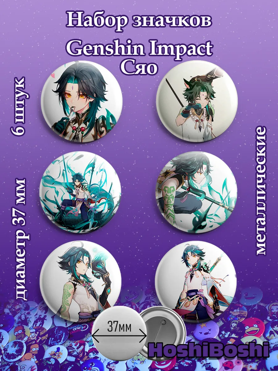 Набор из 6 металлических значков с изображениями из игры Геншин Импакт ( Genshin Impact ).