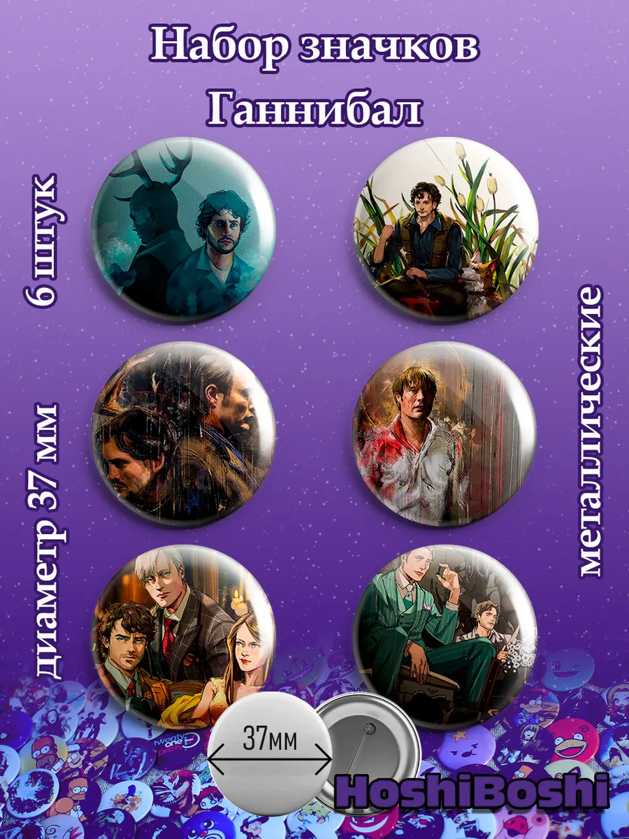 Набор из 6 металлических значков с изображениями из сериала Ганнибал ( Hannibal ).