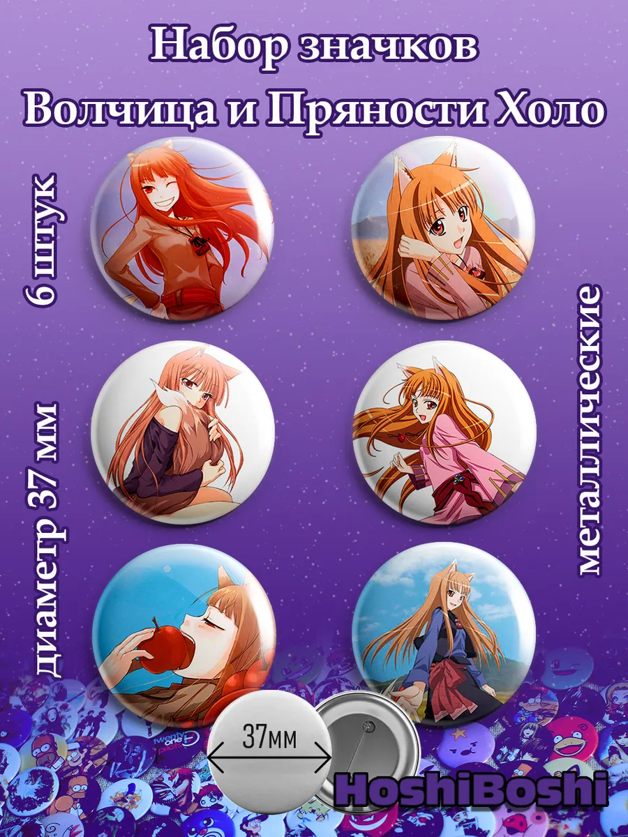 Набор из 6 металлических значков с изображениями из аниме Волчица и пряности ( Spice and Wolf Ookami to Koushinryou ).