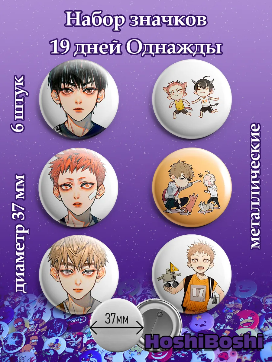 Набор из 6 металлических значков с изображениями из манхвы 19 дней Однажды ( 19 Days — One Day ).