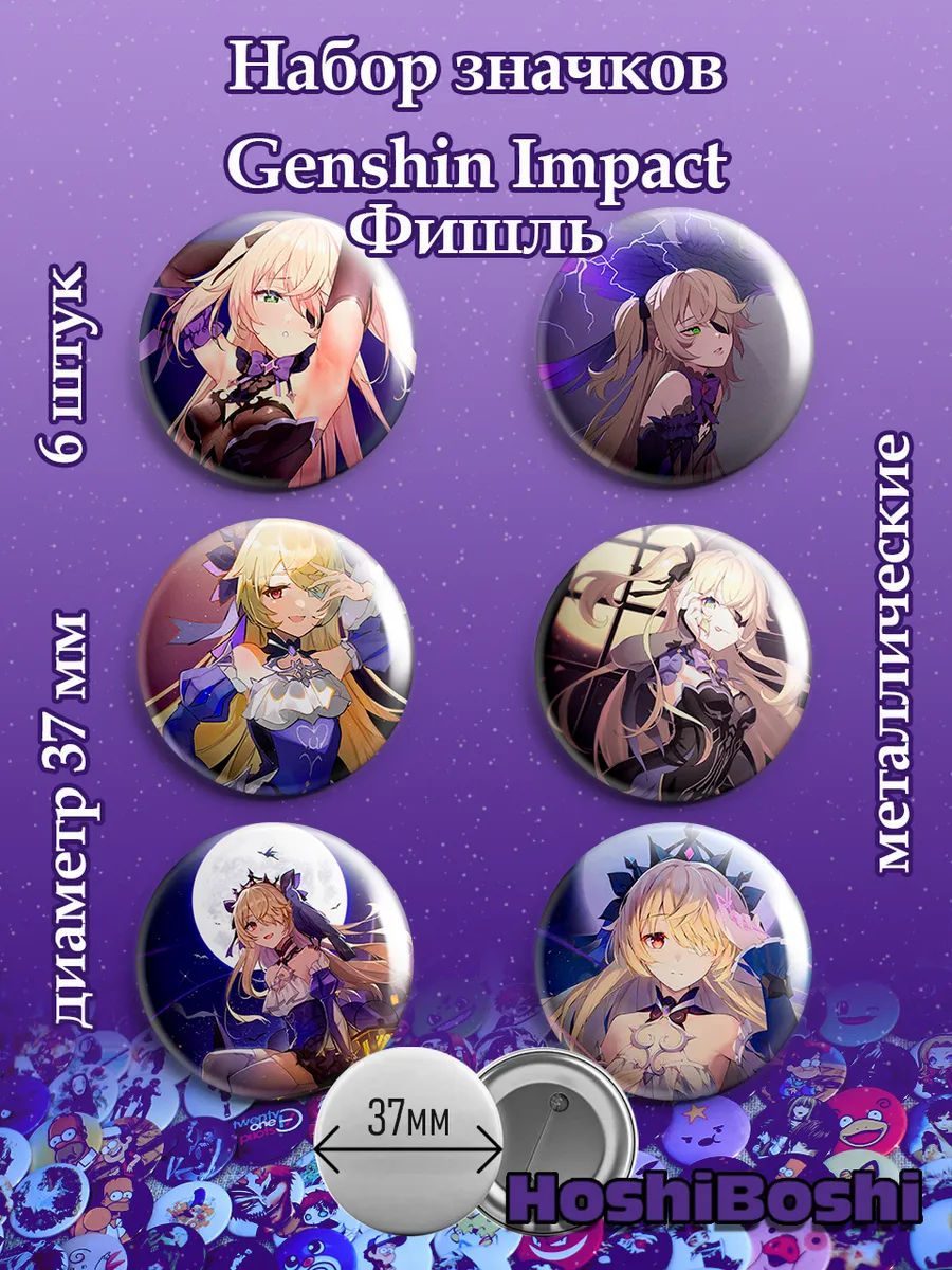 Набор из 6 металлических значков с изображениями из игры Геншин Импакт ( Genshin Impact ).